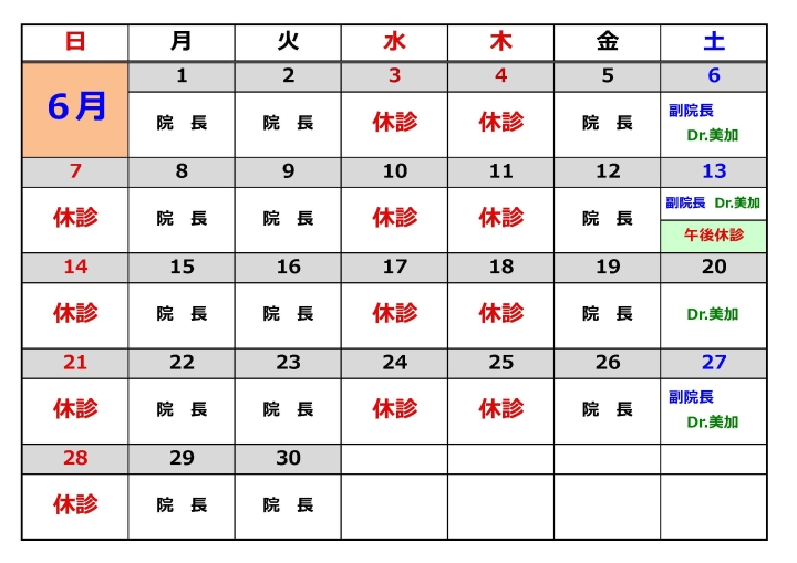- 6月13日(土)は、副院長、Dr.美加 研修会に出席するため、午後の診療を 臨時休診 とさせていただきます。 診療時間は 8:30〜13:00 となります。