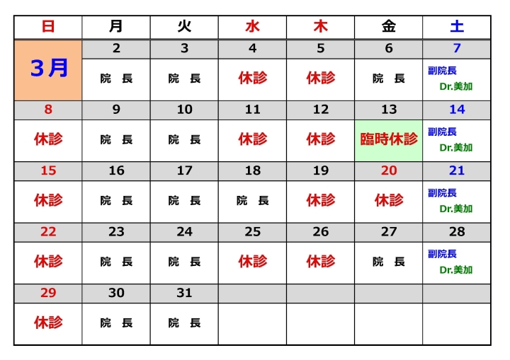 現在の診療担当日は、下記の通りです。
