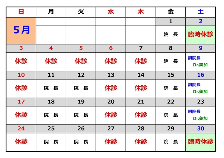 - 5月2日(土)は、副院長、Dr.美加 所用のため、臨時休診とさせていただきます。